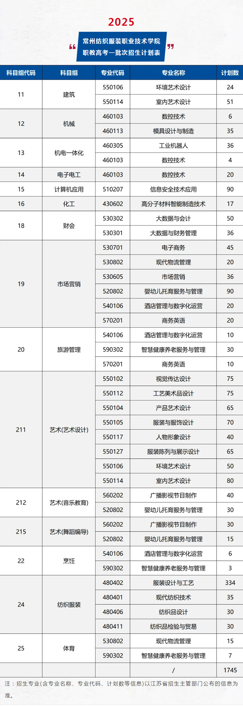 2025常州纺织服装职业技术学院职教高考一批次招生计划表